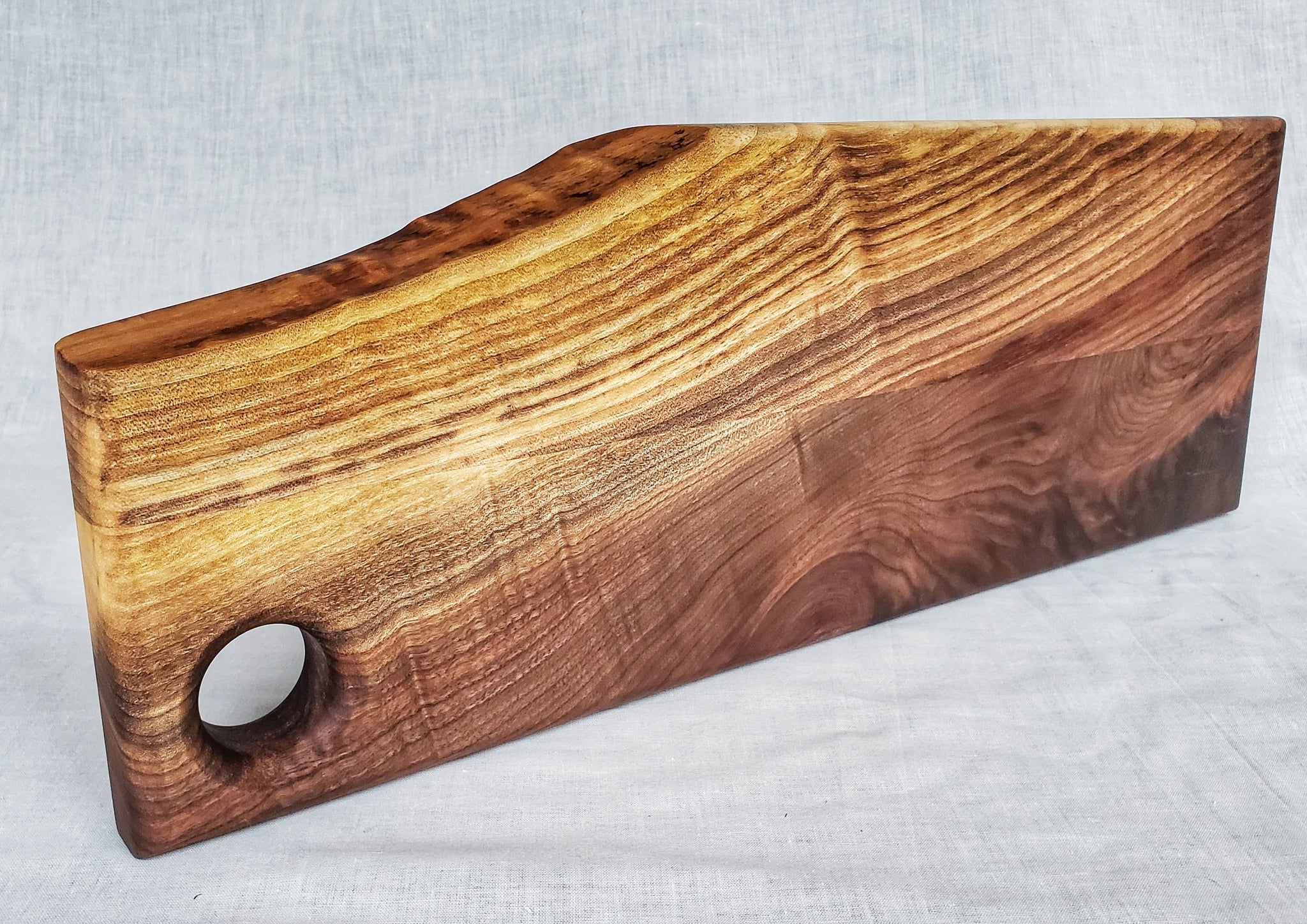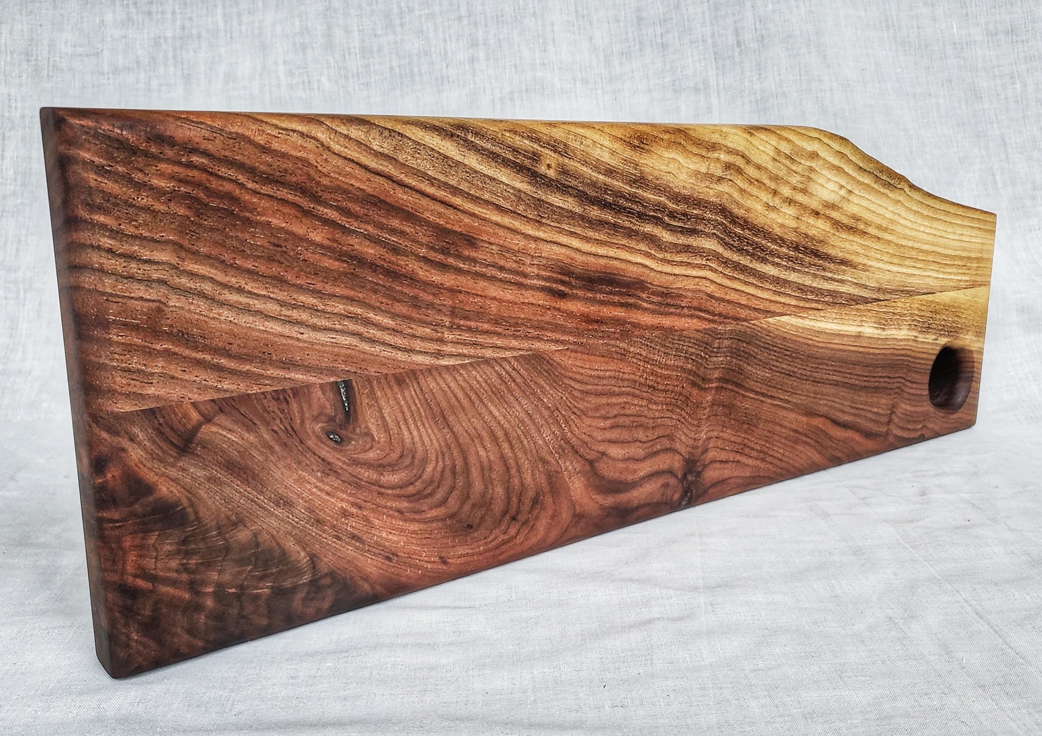 Constructed from solid Walnut it has a small live edge giving this cutting board its own unique style. The edges have been rounded over to give the board a smooth, comfortable in hand feel.