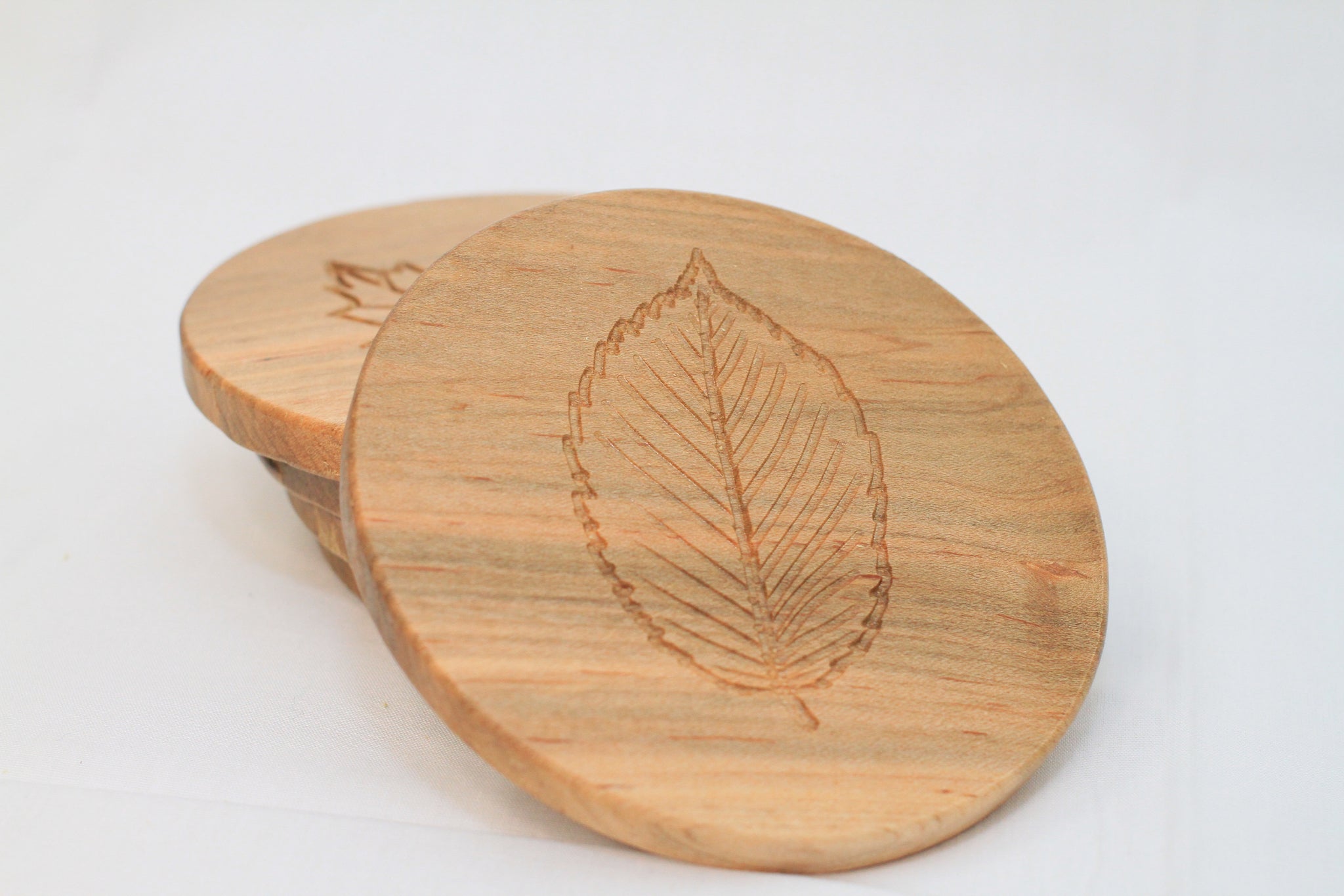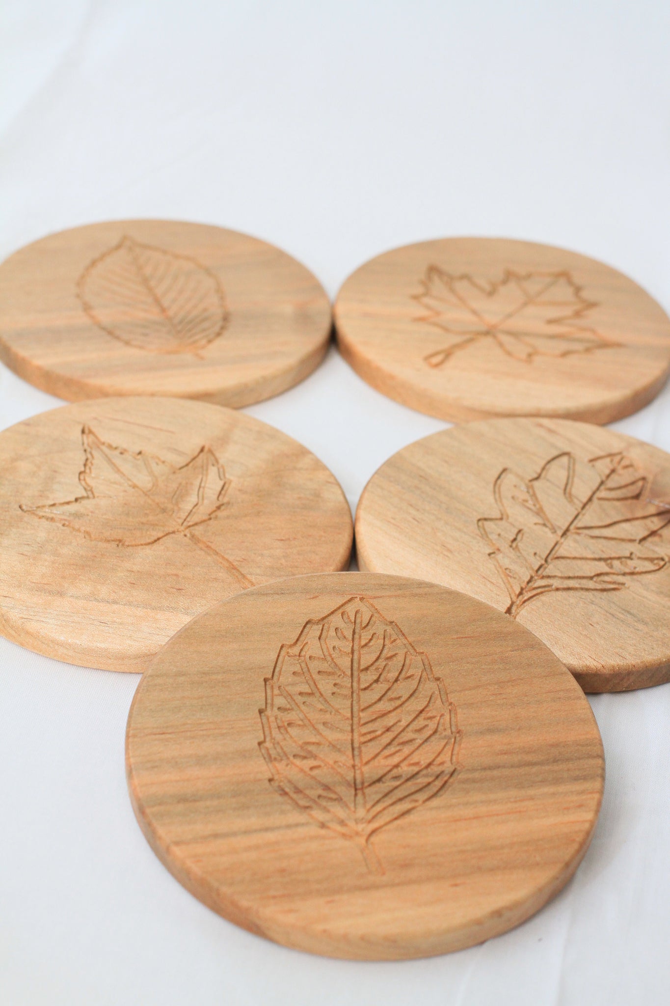 5 Solid Maple coasters with New England inspired leaves engraved to catch the drips or sweat from glasses, keeping your tables ring free and looking good while doing it.
