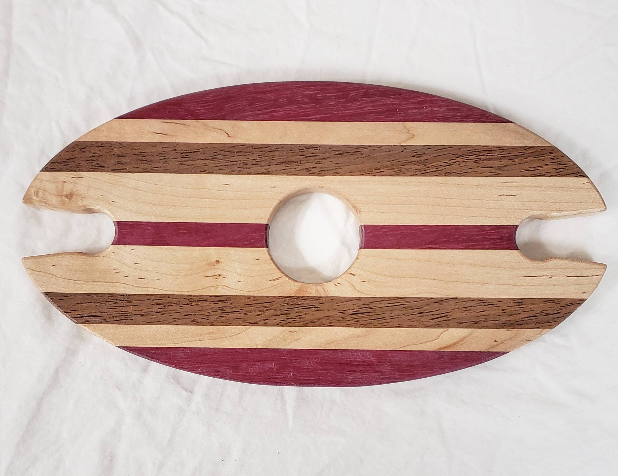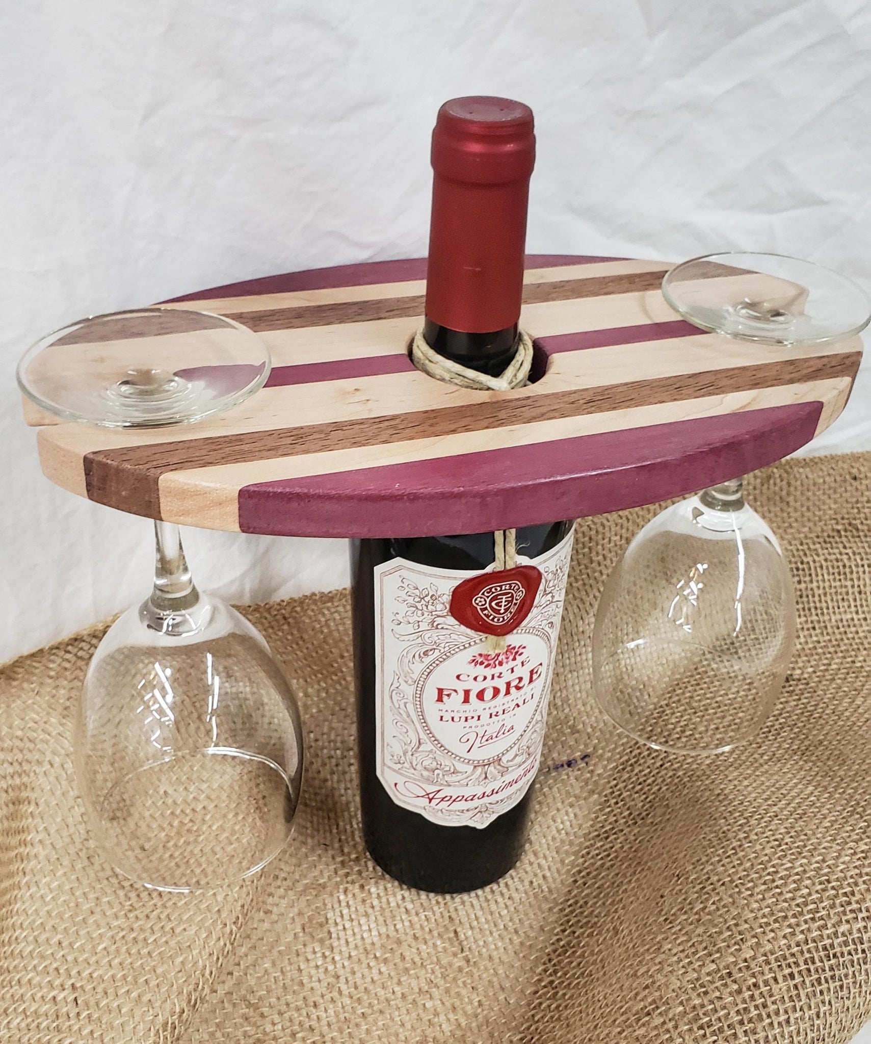 This hand made wine caddy is constructed from Walnut, Purple Heart & Maple.